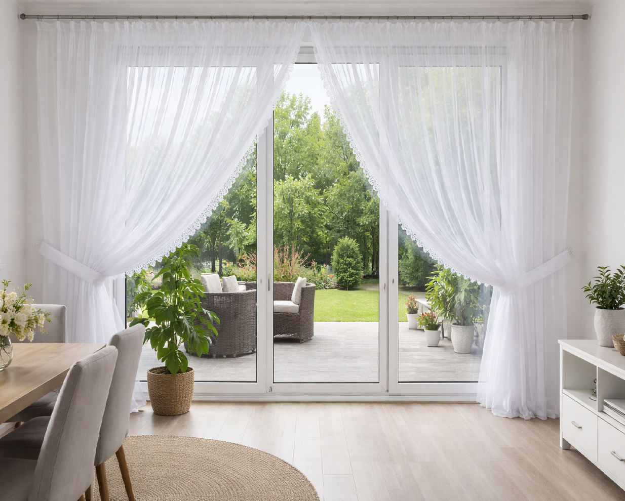 Całość prezentuje się lekko i elegancko – firana nie przytłacza wnętrza, a jednocześnie stanowi wyraźny, dekoracyjny element aranżacji okna tarasowego.