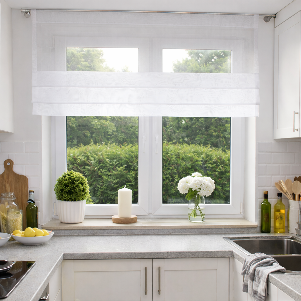 Gotowa krótka firanka do kuchni z woalu.